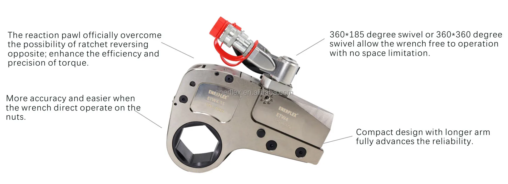 ETW series is the professional hydraulic torque wrench which vigorously extends in international market. Compare with the square drive hydraulic torque wrench, this series work directly on the nuts and its bod suits well in the narrow space.